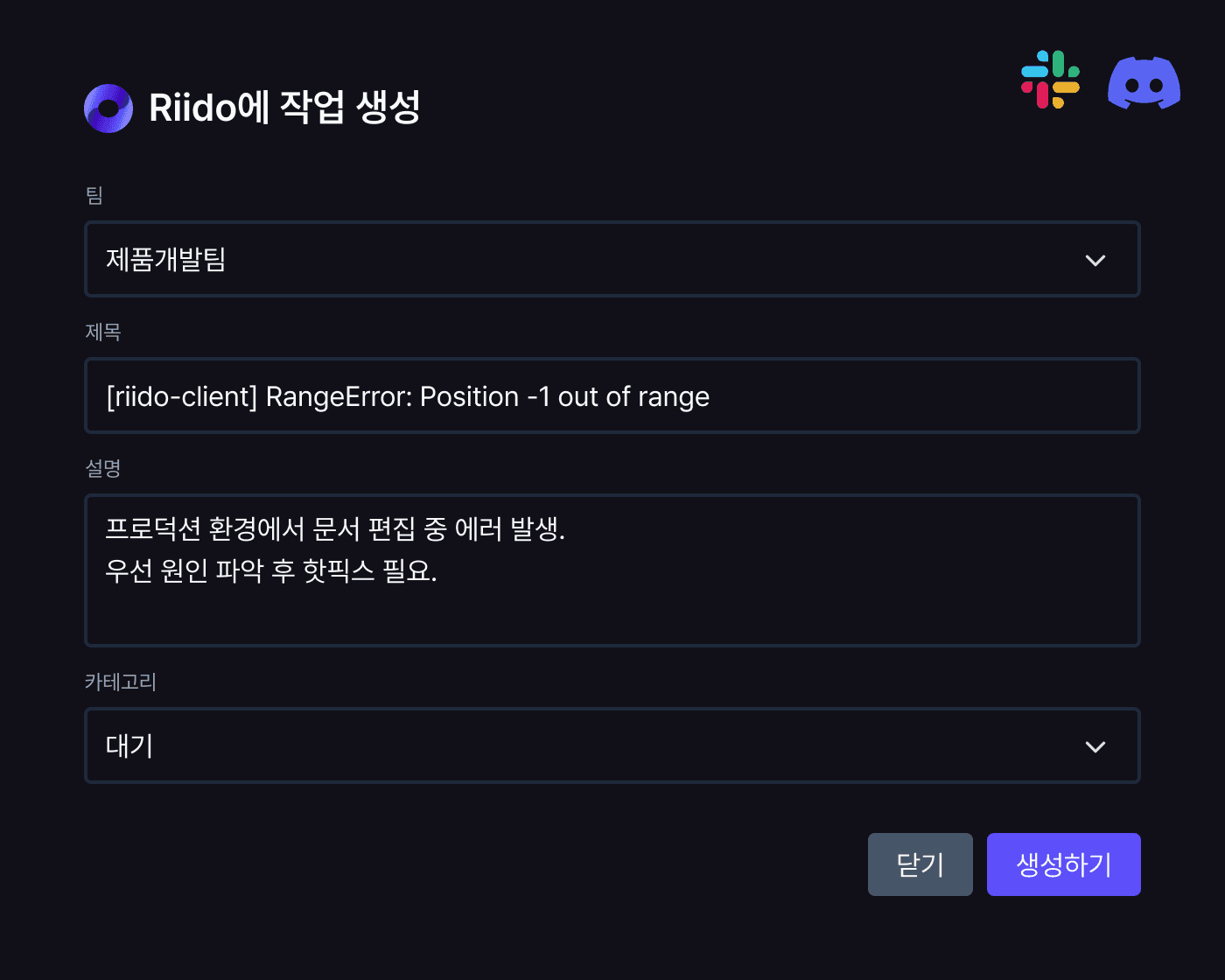 Slack · Discord에서 작업 생성