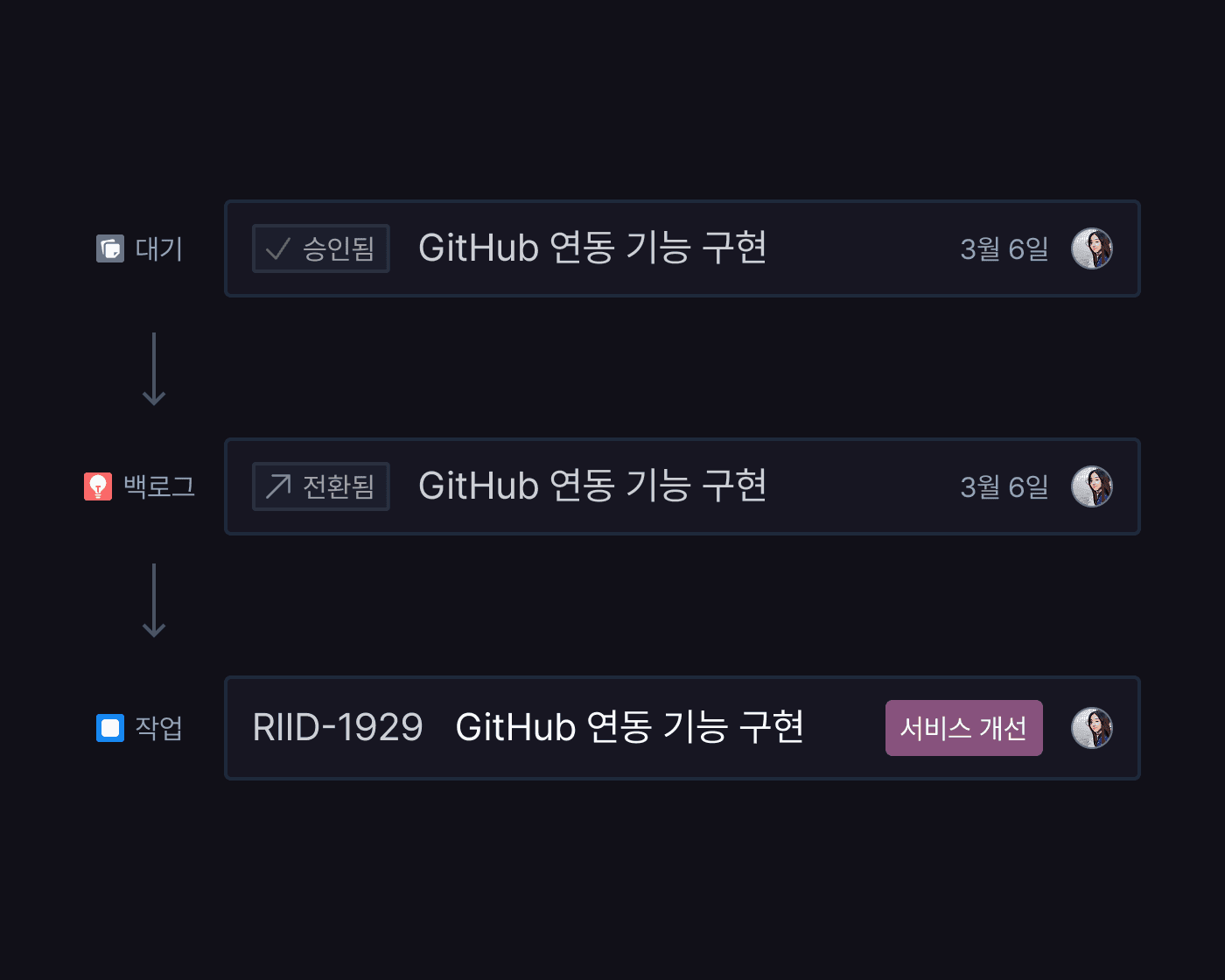 무분별하게 추가되는 작업으로부터 팀을 보호합니다. 모든 아이디어를 '대기'와 '백로그'를 거쳐 실행할 것만 '작업'으로 전환해, 팀이 지금 집중해야 할 일만 남깁니다.