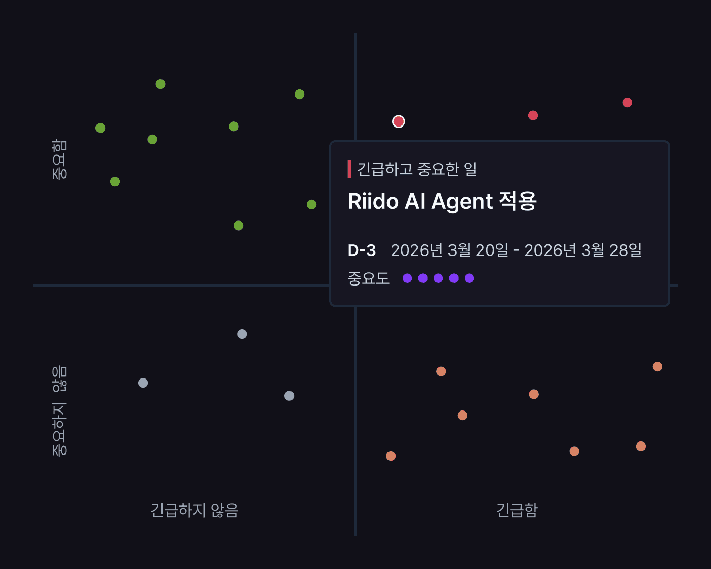 중요도와 긴급도를 기준으로 작업을 시각화해, 가장 가치 있는 일부터 실행하도록 돕습니다. 막연한 계획 대신, 기준 있는 선택이 가능합니다.